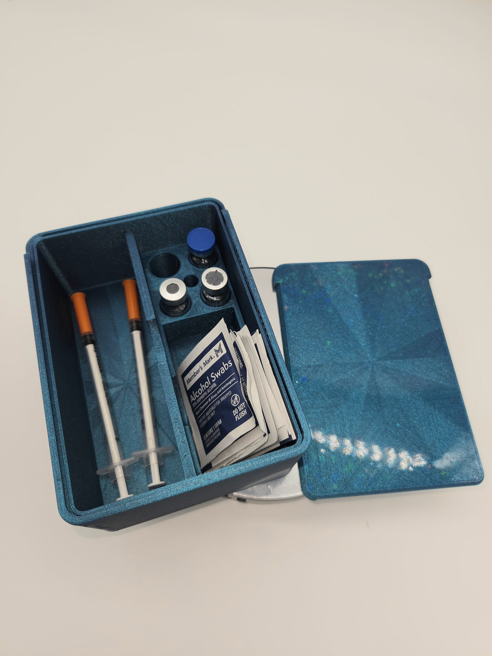 Organize your syringes, four 3ml vials, and alcohol pads in this travel-ready Slide N Lock case. The middle slot holds your syringe upright, cap-side down, for easy storage and access. Available in multiple colors to suit your style.